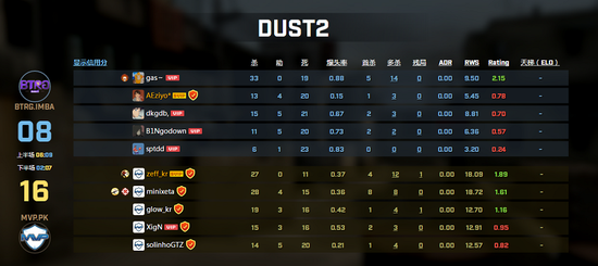 在DUST2这张地图上,先做进攻方的BTRG上半场与对手互咬比分,gas超高的手感连续刷屏,但是依然击破不了MVP的防守,上半场最终比分定格在6:9,下半场赢下手枪局的MVP开始拉大比分差距,zeff和minixeta的进攻为MVP加快了节奏,而只有gas一人的火力点的BTRG却独木难支,BTRG下半场只拿到了两分,最终MVP16:8赢下了这场比赛的胜利。