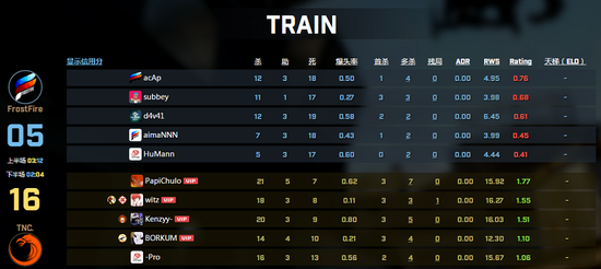 图二Train上,TNC再次延续上一把完美的手感,赢下手枪局后扩大优势,在witz完成一波1V2的残局后,TNC找到自己的节奏,FrostFire上一把没有手感的两名队员这一张图上依然默默无声,上半场TNC12:3再次获得大优势,下半场进攻的TNC赢下长枪局后使得比赛早早结束,最终TNC 2:0 FrostFire,获得第与5P共同出线的资格。