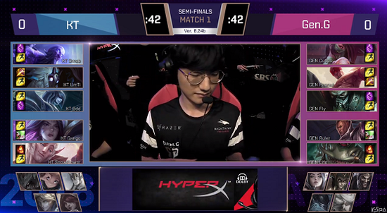 开局双方打野同时来到中路,GEN打野小花生击杀Bdd拿下一血,KT则收掉GEN中单Fly。