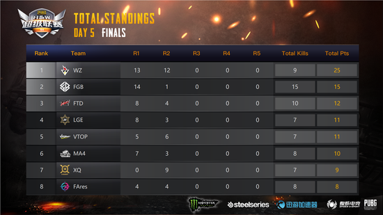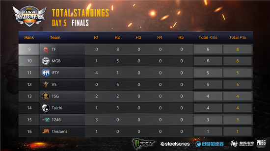 【第五局】决赛圈五支队伍,TF开车强冲XQ房区,被XQ一颗雷淘汰出局。V5、MGB和XQ三方交火,MGB先被XQ击杀。V5转移时被XQ一波集火,只剩一名独狼窝在房区。XQ丢雷无果之后,选择放弃冲房。WZ独狼率先发难,击杀XQ一名队员。但同时也被XQ队员发现位置,直接淘汰。V5独狼随后也被击杀。XQ也凭借最后一把的神勇表现将排名分升至第三位。