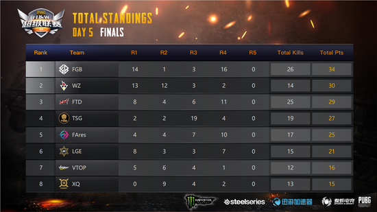 【第四局】决赛圈五支队伍都是残编,FGB处于圈中有利地形,TSG独狼被FTD独狼击杀,FTD独狼随后被电网电死。LGE独狼击杀FA一人之后被FGB淘汰出局,仅剩一人的FA不敌FGB两人围攻。FGB成功吃鸡之后排名也顺势超越WZ成为榜首。