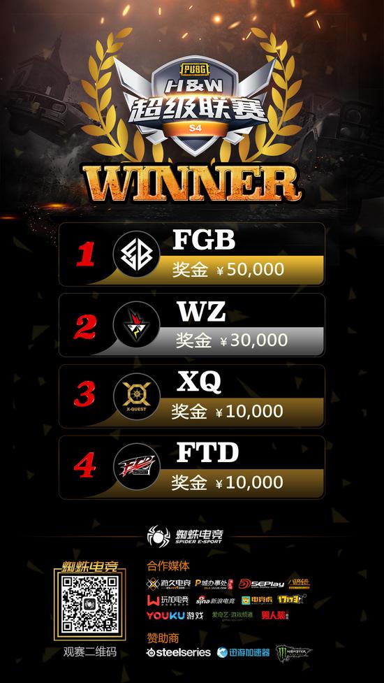 经过5局的艰苦鏖战,最终FGB战队爆冷逆袭夺得冠军,WZ战队获得亚军,XQ获得季军,FTD获得殿军。也感谢其他战队一同为我们奉献的精彩比赛!最后再次感谢SteelSeries赛睿、迅游加速器和MonsterEnergy魔爪联合赞助,游久电竞、P城办事处、5EPlay、八倍镜、玩加电竞、新浪电竞、电竞虎、17173电竞、youku游戏、爱奇艺游戏频道和男人装等媒体鼎力支持。蜘蛛电竞H&W超级联赛第四季到此结束,另外在2019年1月2日,蜘蛛电竞H&W公开赛将再燃战火!全年将会有2000场精彩赛事,1000万赛事奖金,明星战队第一视角和队内语音,让你聆听最真实的战地之声。各位喜欢电竞赛事的朋友们千万不要错过!