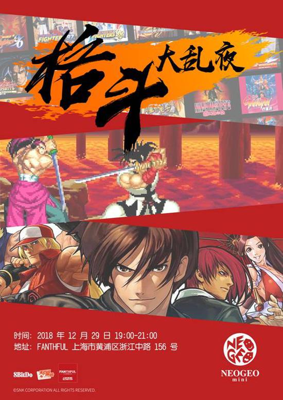 2018年 12月 29日晚,SNK中国区授权方授权八位堂(8BitDo)联合天下聚会、FANTHFUL在上海市黄浦区浙江中路156号 FANTHFUL举办格斗大乱夜。一百余名游戏玩家参与现场互动活动,并在现场进行游戏交流。