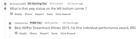 这些奖杯包括了 2017 IEM 悉尼站冠军、MLG 哥伦布 Major 冠军、EPL 冠军等等。有人询问到左下角的 AWP 是哪个奖项,原来这杆狙也来头不小,是 FalleN 在 2015 Dreamhack 冬季赛上获得的最佳狙击手称号,也是他第一个个人奖项。
