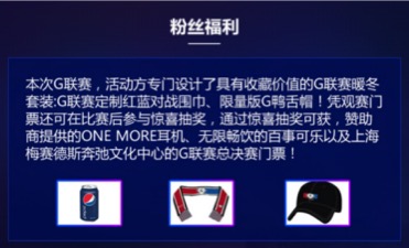 本次G联赛,活动方专门设计了具有收藏价值的G联赛暖冬套装:G联赛定制红蓝对战围巾、限量版G鸭舌帽!凭观赛门票还可在比赛后参与惊喜抽奖,通过惊喜抽奖可获,赞助商提供的1MORE万魔耳机、无限畅饮的百事可乐以及上海梅赛德斯奔弛文化中心的G联赛总决赛门票!