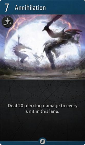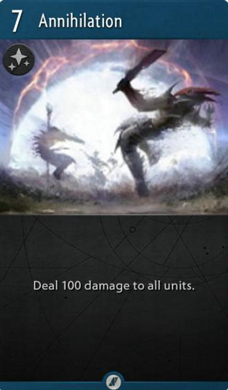 3.将灭绝改为增益卡。费用不变保持6费,但是灭绝将变成增益牌,这意味着你需要两个操作才能打出原先灭绝的效果,这不仅能让你对手有提前防范(使用TP或者跳刀)而且也容易被去除增益牌的卡给剔除导致崩盘。但是可以一直挂着先不用(战略性威慑?)可能也算是种正面效果,但总体来说弊远大于利。