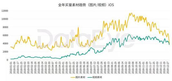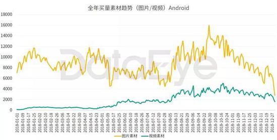 从投放素材的类型来看,无论是iOS还是Android,图片素材投放量都处于缓慢增长的状态。与之相反的是视频素材,下半年以来视频素材投放量直线上升,Android渠道的视频素材投放量最高达到5060组,而iOS渠道的视频素材投放量最高则是6227组,视频素材投放高峰期数量接近是低峰期数量的十倍。