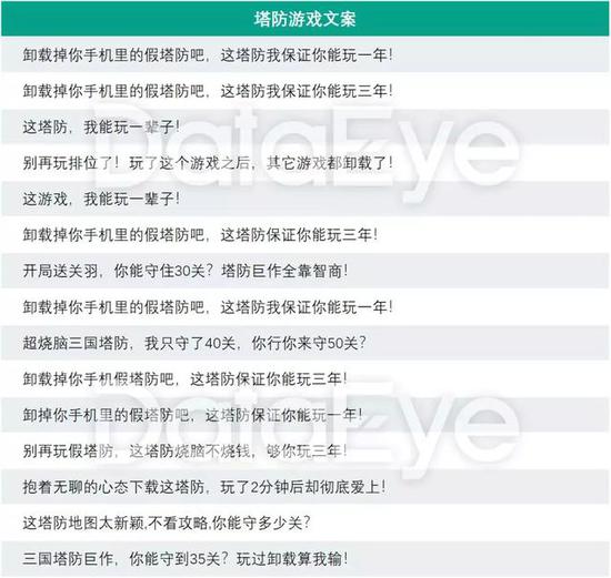 在文案内容上,塔防类游戏除了运用“卸载掉假塔防,这款塔防保证能玩xx年……”的格式之外,也会使用三国题材吸引目标用户。