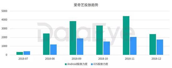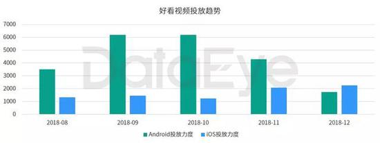 爱奇艺渠道在2018年8月迎来大幅度增长,但是在12月Android投放素材数出现较大的下滑。好看视频渠道在11月和12月的Android投放素材数出现下滑,与之相反的是iOS投放素材数保持增长。