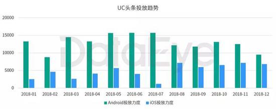 除了抖音之外,今日头条的投放素材数也在2018下半年迎来了较大的增长,7月份和8月份的iOS投放素材数一度超过Android。手机百度除了在5-6月出现滑坡之外,其余月份的Android投放素材数保持在一万五以上,9月份一度逼近3万。UC头条2018年表现平稳,不过在年末有小幅度下降。
