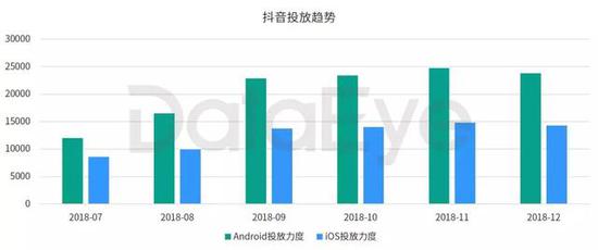 拿下TOP5位置的抖音,是2018年买量渠道最大的“黑马”。从投放趋势可以看到,2018年下半年以来抖音的投放素材数变直线上升,从9月份开始便一直保持在2万组以上。