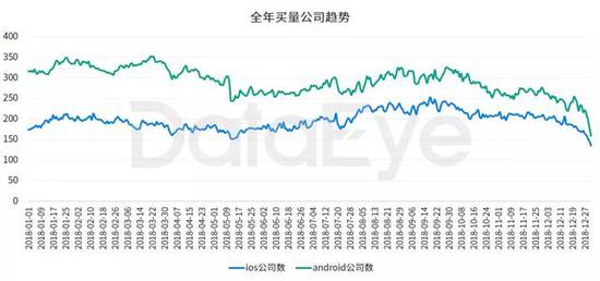 值得注意的是,和投放产品数的曲线相反,2018年参与买量的公司数总体呈下降趋势,单日最高参与公司数为430家。Android渠道的参与买量公司数从年初的300多家跌至年末150多家,而iOS的参与买量公司数基本保持在150至250家,下降幅度较小。
