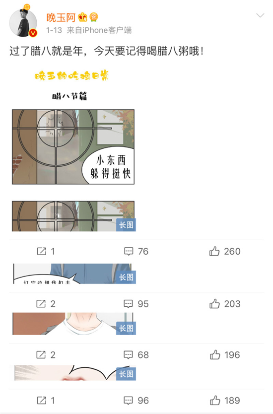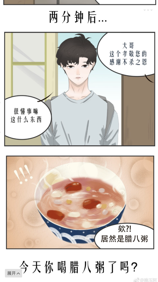 绕了半天弯子,晚玉是想通过一张漫画来提醒大家,腊八节该喝腊八粥啦,可见晚玉富有天马行空的想象力,而这不就是每位漫画家必备的品质吗?看来,晚玉以后哪怕不做直播行业了也不怕没饭吃,他可以考虑成为一名高颜值的天才漫画家。在晚玉微博,还有许多类似的漫画等待着大家去发现,而晚玉的粉丝也非常喜欢看晚玉所发的漫画,几乎每张漫画底下都有着几百个赞和一定的评论数,原来大家都有认真欣赏晚玉用心带来的漫画作品。