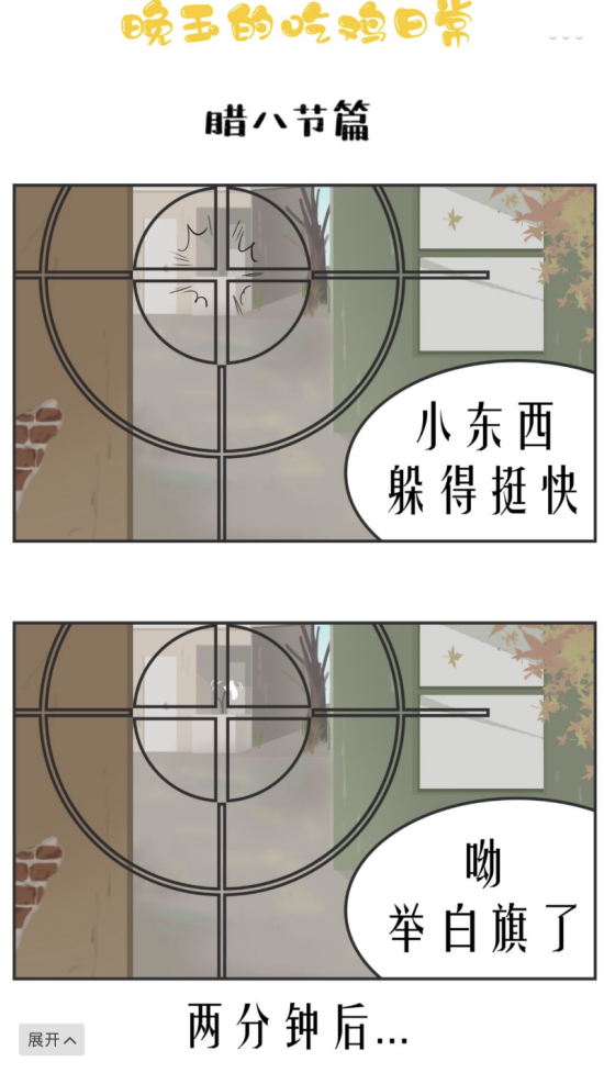 前段时间正值腊八节,每个吃货都嚷嚷着要喝腊八粥,而晚玉竟然在刺激战场里成功喝到了一碗香喷喷的腊八粥。在这张漫画里,晚玉变身“狙王”,在千里之外瞄准了一位以迅雷不及掩耳躲进屋里的胆小敌人,或许这时的敌人早已料到了前方有险情,直接向晚玉举起了白旗,选择放弃这场比赛。