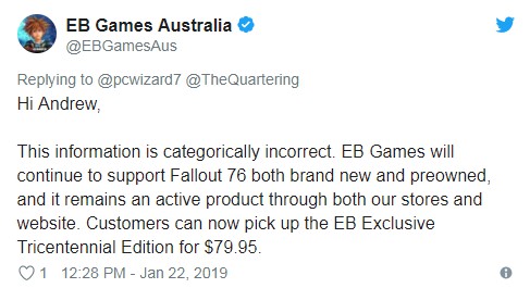 而EB Games也发布声明称:“此消息绝对不正确。EB Games将继续支持《辐射76》,无论是新的还是二手的,它仍然是我们商店和网站的活跃产品。”