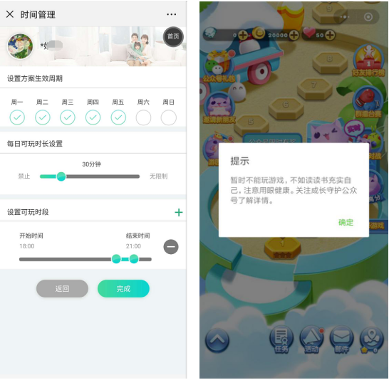 管理:家长可在超级家长中设置游戏时长、时段或“一键禁玩”,未成年人在不可玩的时段登录微信小游戏,小游戏会弹出提示。