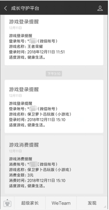 通知:未成年人登录微信小游戏或在小游戏中充值消费,成长守护平台公众号将向家长推送通知。