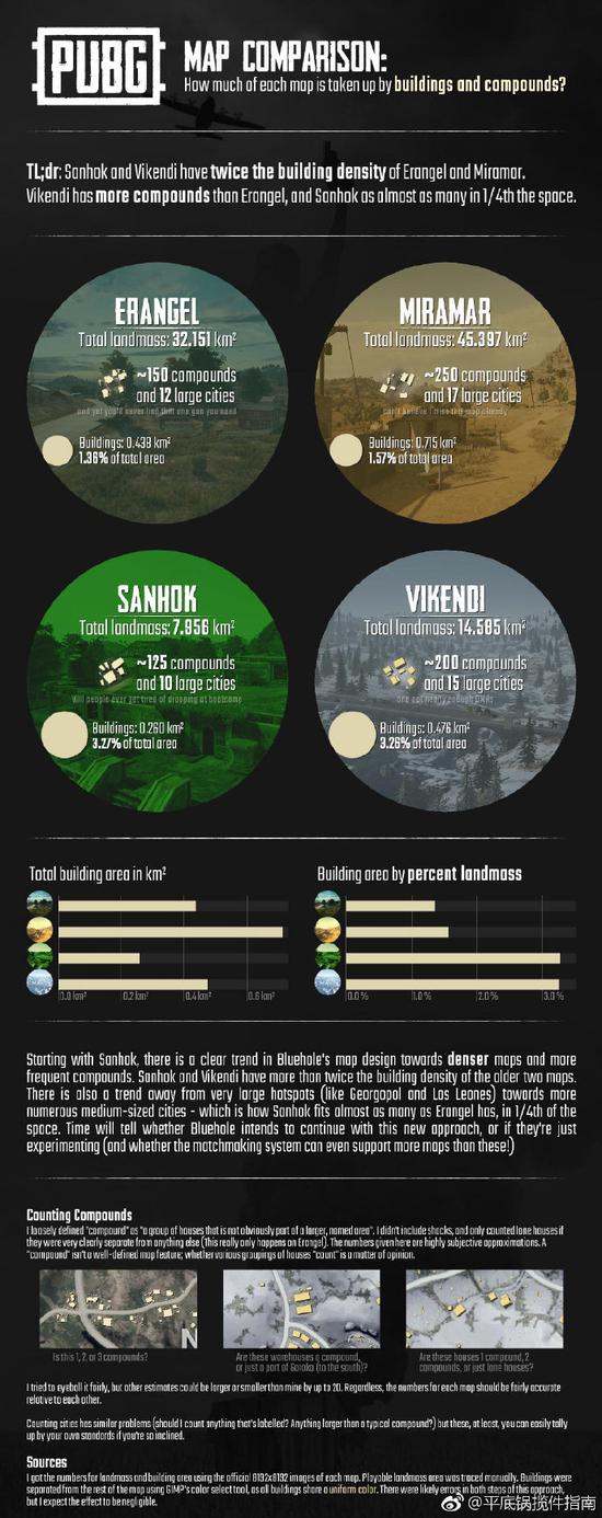 国外网友 blast_ended_sqrt 制作了一张信息图,对比统计了 PUBG 目前四张地图中建筑占总地图面积的比例。图上字很多,就不汉化了,说下重点: