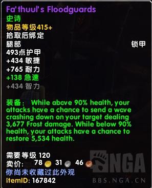 装备:血量90%以上时,你的攻击有几率对目标推波造成3677冰霜伤害。血量低与90%时,你的攻击有几率恢复5534生命值。