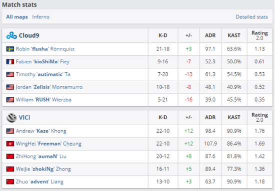 这场比赛的选图为Inferno,手枪局被VG拿下因此他们取得了领先,C9的ECO后进行了长枪局,虽然拿到了第一分,但VG送给了一个经济重置,Auman在ECO局拿下四杀。Flusha的一波单人A区双杀为队伍减少了压力,C9拿到自己的第二分。但局面渐渐的还是被VG重新掌握到手上,C9的进攻压力非常大,kaze的狙击枪和Freeman的步枪非常亮眼,疯狂刷屏,半场结束后VG以11-4大领先。