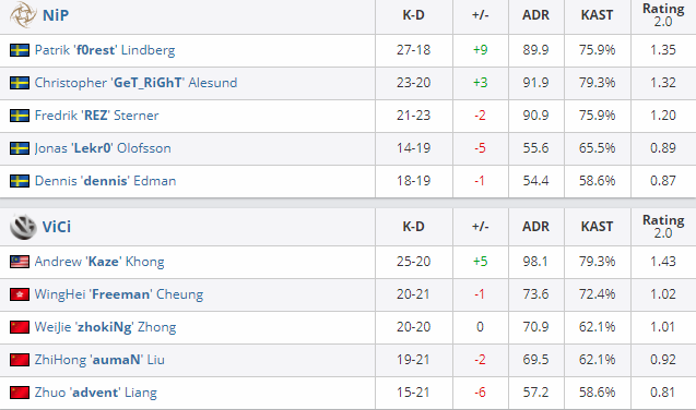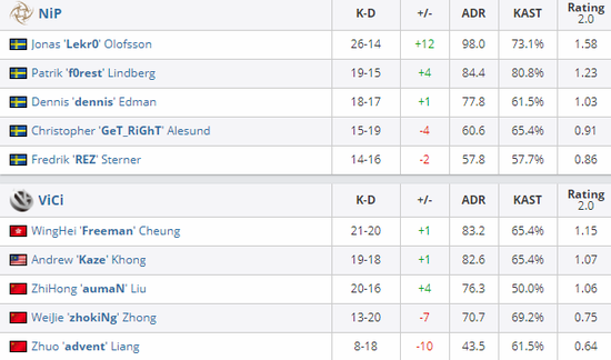 下半场‘畜生档’的老F直接USP三杀拆包,随后的VG在枪法直接被NIP碾压,下半场VG没能夺得一分,最终图一以16-7结束。
