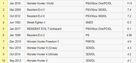 卡普空自家游戏销量排行榜TOP10: