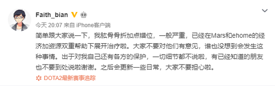 在Mars的道歉声明以及EHOME的官宣后,Faith_bian也发了微博,简单介绍了下自己目前的情况。