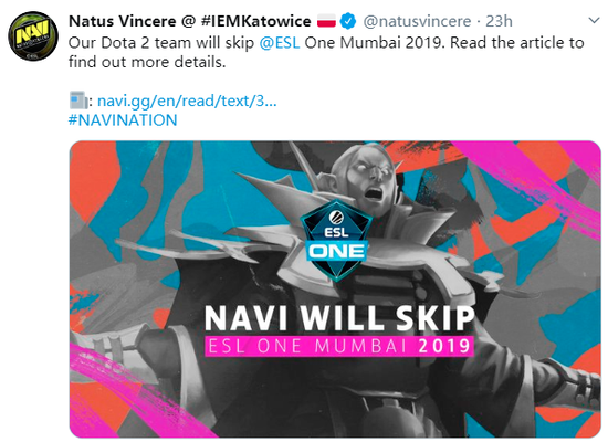在NaVi的公告中,他们表示近期战队的日程安排非常紧,而ESL One孟买站可能会与他们参加的其它赛事冲突。