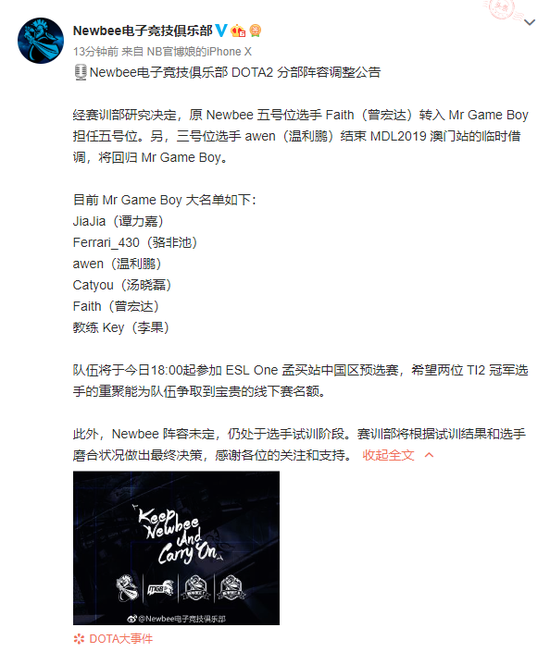Newbee电子竞技俱乐部 DOTA2 分部阵容调整公告