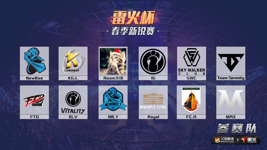 雷火杯春季赛既有iG、Newbee、FTD等老牌俱乐部,也有像Room310、FC.A等新锐战队。在之前结束的竞技宝杯春季赛中,iG战队斩获亚军,Room310也取得了第四名的好成绩,而Newbee战队因为试训新选手和教练替补等因素表现不佳排名垫底。