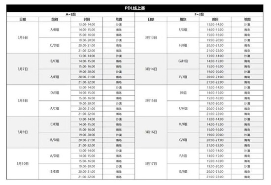 PDL春季赛线下赛的比赛时间为3月23日-3月26日以及3月28日-3月31日,晋级的48支队伍将重新抽签分为6组进行单循环赛,具体晋级规则与线上赛相同,所有比赛结束后积分排名前12位的队伍晋级PCL季前赛线下赛!