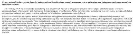 上图的翻译如下:“我们可能没有意识到我们最近宣布的重组计划所带来的财务和运营收益影响,该计划的实施可能会对我们的业务产生负面影响。2019年2月,我们宣布了一项重组计划,根据该计划,我们计划将我们的资源重新集中在我们最大的IP上,并从我们业务的某些部分剔除不必要的冗余和重复。虽然我们相信这个重组计划将使我们能够为众多人才提供更好的机会,并且能更好地利用业务部门的专业和规模,但我们在预期时间范围内从重组计划中获得预期收益的能力取决于许多预估和假设,其实际效益可能会因当地劳动法规,与第三方的谈判以及运营要求等因素不同而有很大差异。这些预估和假设也受到重大的经济、竞争和其他不确定因素的影响,其中一些是我们无法控制的。此外,我们不能保证我们的业务将比计划实施前更有效率,也不能保证将来不需要或不执行其他重组计划。这项重组计划的实施可能会对我们的业务造成成本支出增加和影响,或产生其他负面影响,比如我们计划裁员以外的人员流失,或对员工士气和生产力,或对我们吸引和留住高能力员工造成负面影响。任何这些后果都可能对我们的业务产生负面影响。”