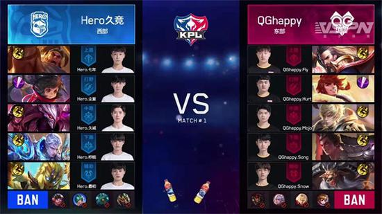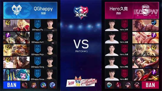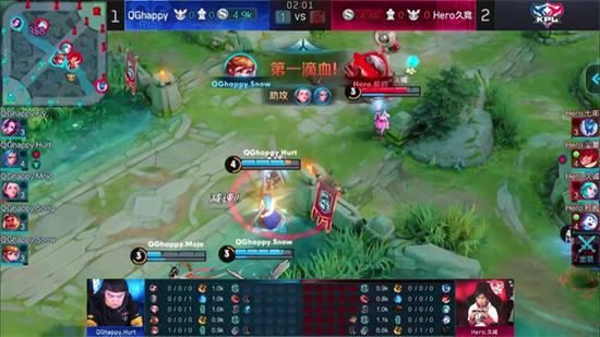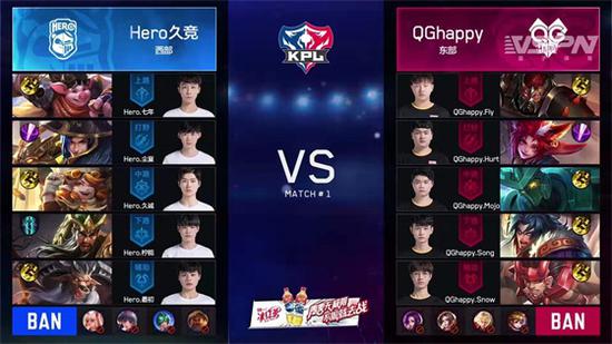 开局两分钟,QGhappy战队率先拿到了第一个暴君,取得了一定的优势。开局四分钟,QGhappy战队的裴擒虎配合牛魔,吕布,赢政入侵敌方蓝区,牛魔利用大闪击飞敌方三人,随后吕布接大,将敌方三人再次击飞,裴擒虎击杀了敌方打野英雄李元芳,拿到一血。开局十八分钟,QGhappy战队配合推掉了Hero久竞战队的第一座高地。最后一波团战中,QGhappy战队的牛魔大闪,配合曹操击杀了铠,然后嬴政击杀了苏烈。这时,三路兵线到达,Hero久竞战队大势已去,输掉了第一场比赛,QGhappy战队领先一分。