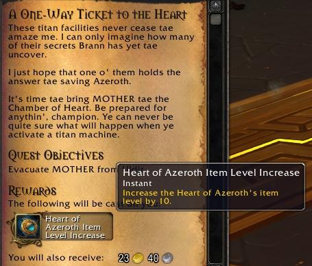 在最新的PTR版本中,任务线有了细微的变化,完成最后一步任务时,你的艾泽拉斯之心将会提升10个物品等级。