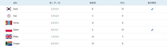 D组中韩国选手Dark轻松全胜出线,而波兰选手Elazer紧随以后,以四胜一负的成绩确定了自己的十六强名额。排名三四的中国台湾选手Has和蒙古选手SIORAS虽有精彩表现,但也只能遗憾出局。