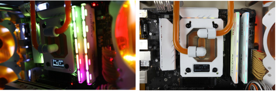 搭配专业水冷排散热系统和三星 970 EVO 256G NVMe.M.2硬盘,黑橙相间的冲锋枪就像机器人的臂膀强而有力。透明机壳能让玩家在夜晚感受到硬件色彩碰撞后所呈现的炫酷灯光。