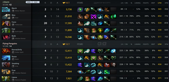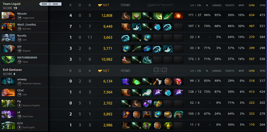 在战胜EG的第二局比赛中我们可以看到,马桶哥偷学的国服高分路人打法——大鞋阿托斯毒龙打得EG心态爆炸。在比赛过程中甚至出现了五人抓毒龙被打出1换4的草自拍。而奇迹哥也是拿出招牌剑圣,稳定发挥。结果自然可以预料。仅仅20分钟就让EG打出了GG。虽然EG也是吃了当家明星Sumail不在的亏。但是就算没有Sumail,EG肯定也是一只一线强队。这也从侧面反应了液体火热的状态。