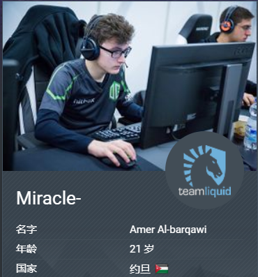 液体的一号位选手Miracle。作为一个国外选手却在国内有着超高的人气,国内的粉丝都尊称他一声奇迹哥。21岁的他有着和年龄不符的大脑。最早在OG作为中单选手出道的他有着扎实的基本功,当他拿出他的绝活卡尔时,他就是可以创造无限奇迹的存在。在最近的比赛中,他经常会和马桶哥换位置,当选出卡尔火猫时,就由他来操刀回归到他以前最擅长的中单位置。而最近的许多时间都是打的CARRY位。在Carry位置的他有稳定的输出和高速的发育,最近奇迹哥的绝活是PA。只要看到他的PA,总是给人一种这把稳了的感觉,可能这就是奇迹哥的魅力吧。