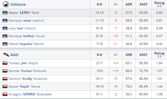 图三来到Dust2,逐渐找回手感的AGO先作进攻方,上半场强有力的攻势屡次撕开对手防线,关键局也没能给对手一点机会,不断打乱Valiance的经济,最终11-4暂时领先。下半场攻守互换,防守方的AGO在丢掉手枪局之后翻盘成功连拿两分,又将Valiance经济重置,拿下关键局之后率先拿下赛点,并且轻松拿下最后一分16-6拿下决胜图。总比分2-1战胜Valiance晋级四强。