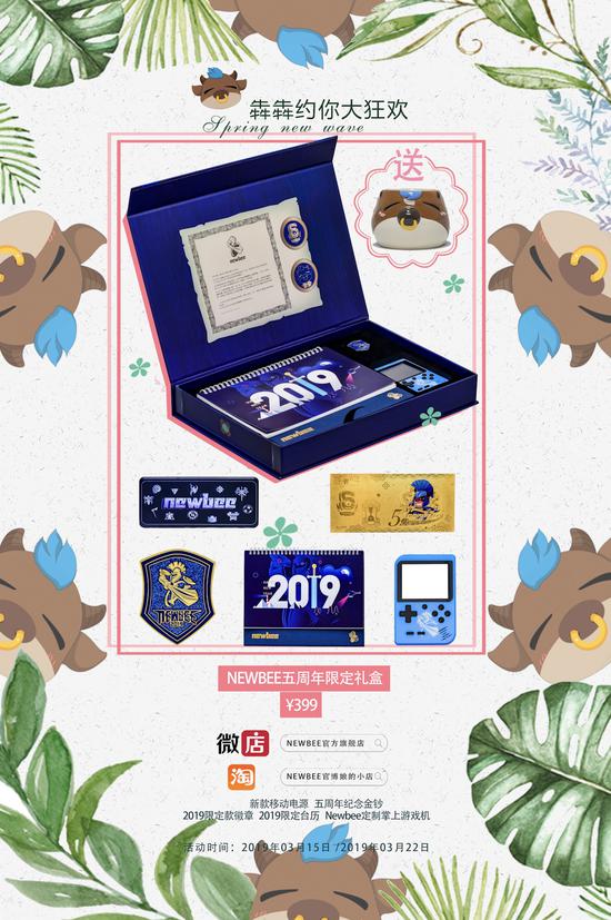 “闪耀五载,远征星海”——Newbee五周年限定礼盒在大家的翘首以盼中终于来到了大家身边!Newbee五周年限定礼盒采用精致环保的特制硬纸板制作而成,高贵典雅的黑色绒布内衬,将每一件Newbee限定别注款单品温柔细腻的包裹住,这些单品包括五周年纪念金钞、2019限定款徽章、新款移动电源、Newbee定制掌上游戏机、2019限定台历等,饱含着我们内心满满的诚意!