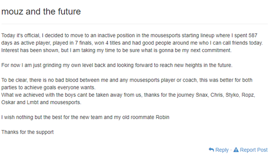 “今天我正式宣布不再担任mouz战队的首发选手。尽管我在这个位置上度过了587个日夜,参加了7个总决赛,赢下了4个大赛冠军,还有一群可爱的人在我身边。但我还是决定离开mouz,让时间来判断我的决定。