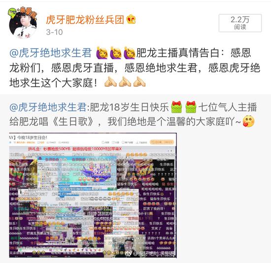 3.8女神节,恰是虎牙主播肥龙在虎牙的第二个生日,虎牙直播为他举办了隆重的生日会,七位《绝地求生》的人气主播为他唱生日歌,80多万粉丝在线收看《肥龙生日会》特辑。