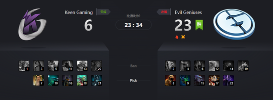 不断压缩KG的生存空间,EG在21分钟杀上KG的高地,并破掉了KG的上路。一波回马枪,EG在22分钟再度冲阵,击溃了KG的防守。劣势巨大,KG也知道无力回天,只能打出GG。