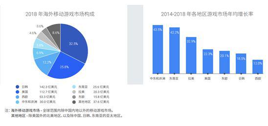 谷歌与伽马数据发布的《中国移动游戏海外市场发展报告》数据显示:日韩、美国和西欧是海外移动游戏的主力市场,所占规模超过 70%。值得注意的是, 虽然中东和非洲及东南亚目前规模较小,但增长率皆超过 40%。