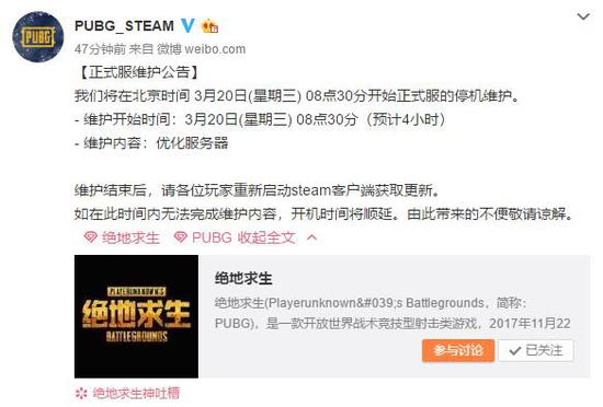 刚刚,PUBG官博宣布明日将进行正式服的例行维护,维护将从八点半开始,预计时间为四小时,维护内容为优化服务器。