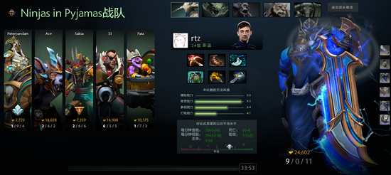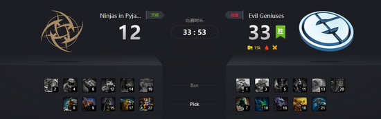 NIP打EG的第一局,他们在Ban人上做的没有KG那么到位。在EG选出毒龙的那一刻,PPD立刻感到大事不妙。虽然33的狼人在反补上有着独特的技巧,把Sumail打的非常难受,但瞧一眼经济面板,毒龙的经济还是在狼人之上。5分钟的时候,33已经被Sumail赶到了野区。对线阶段,NIP的战术全部泡汤。不过,由于NIP在中期的几波小节奏起的还不错,直到20分钟的那波团灭发生前,双方的经济一直相持不下。那一波,RTZ的斯温刚刚拿到自己的10秒BKB。只见这个全身发红的金身斯温几下砍死ACE的熊战士,EG打出了一波零换四的小高潮。
