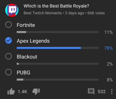 Twitch发起了最受用户喜爱的大逃杀游戏投票。在6万6千多人的投票中,近八成的用户将票数投给了近期大热游戏《Apex英雄》,远超其他游戏,占据绝对优势。