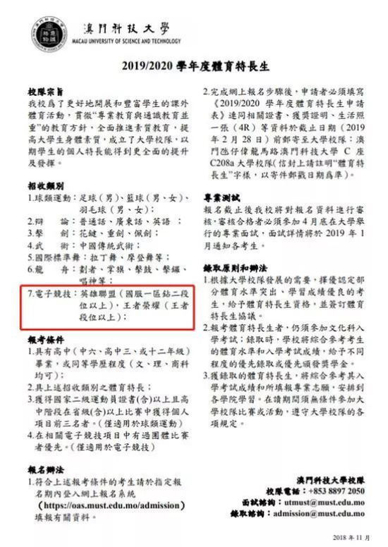 日前,澳门科技大学在2019-2020的招生简章中开始招收电竞特长生,其中提出的一个要求是:《英雄联盟》国服钻2以上段位,《王者荣耀》王者以上段位。而基础学费价格,高达7.5万元港币,折合人民币约6.5万元。