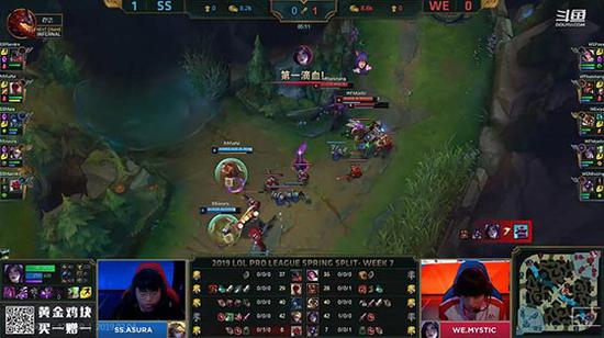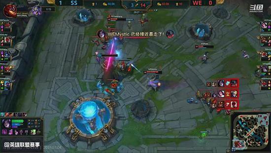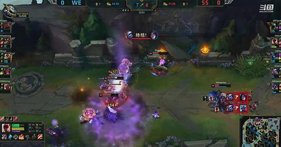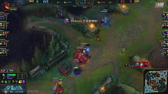 34分钟SS想要主动开团,没有开到,皇子直接反开团,WE抱团身披大龙buff直接中路一波赢下比赛胜利。