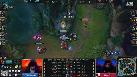 双方第二场比赛WE拿到了几乎与上一局相同的阵容,只是在上单位置上剑姬取代了之前的厄加特。比赛开始后,又是WE打野皇子的积极下路游走,帮助大舅子的卡莎击杀掉对手布隆拿到一血。